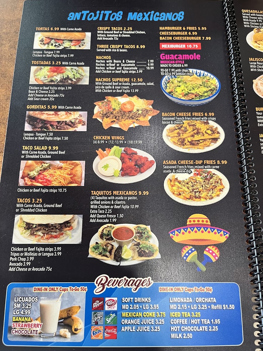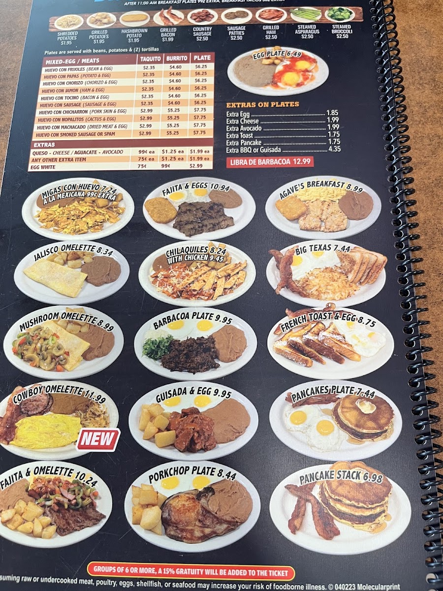 From a reviewer’s perspective, the menu at Agave Jalisco Mexican Restaurant offers a simple yet comforting selection that reflects everyday Mexican flavors, making it a fitting conclusion to the dining experience. The beverage options, including Soft Drinks, Mexican Coke, Orange Juice, Apple Juice, and Limonada, provide both familiar and refreshing choices that pair well with any meal. The breakfast-style Mixed-Egg and Meat dishes stand out for their hearty appeal, such as Huevo Con Frijoles, Huevo Con Papas, Huevo Con Chorizo, Huevo Con Jamon, and Huevo Con Tocino, all of which highlight classic combinations that are satisfying and approachable. The menu also allows for customization through Extras On Plates like Extra Egg, Extra Cheese, Extra Avocado, Extra Toast, and Extra Pancake, giving diners flexibility to tailor dishes to their taste. Simple Side Orders such as Avocado complement the main plates without overwhelming them. Beyond breakfast, the “Others” section rounds out the menu with popular Mexican staples including Tortas, Tostadas, Gorditas, Taco Salad, and Crispy Tacos, ensuring there is something for guests seeking variety and familiar favorites. Overall, the menu feels thoughtfully put together-straightforward, comforting, and rooted in traditional Mexican fare-making Agave Jalisco Mexican Restaurant a dependable choice for those looking for classic dishes served without unnecessary complexity.